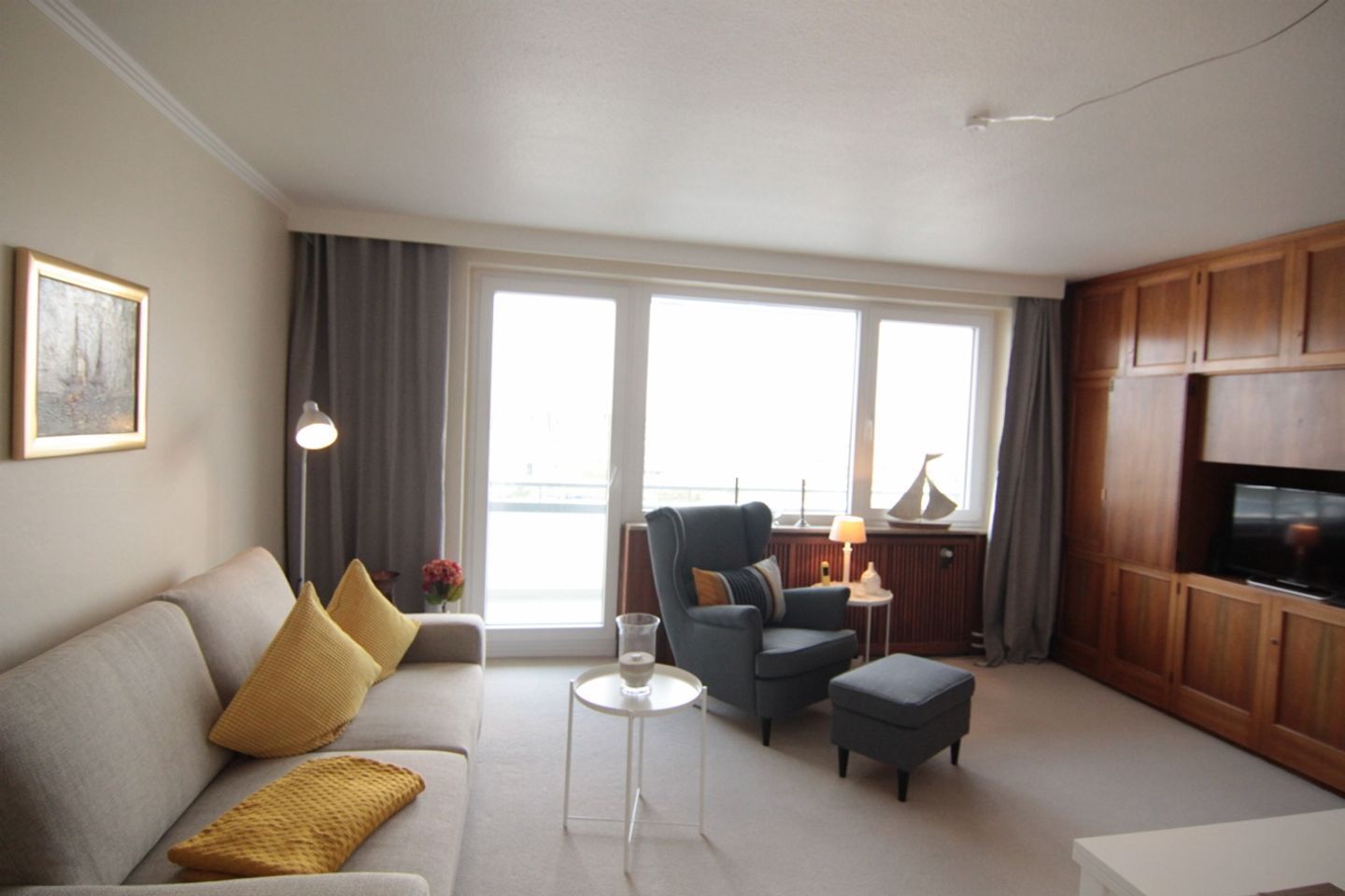 Die Wohnung bietet einen schönen Wohnbereich mit Balkon und tollem Ausblick als Highlight. Der Balkon ist mit gemütlichen Balkonmöbeln ausgestattet und bietet so den perfekten Ort zur Entspannung. Außerdem noch sind ein einzelnes Schrankbett für eine dritte Person, ein Tisch, ein TV sowie Radio vorhanden.