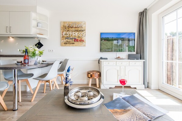 Strandnaher Rückzugsort mit Südterrasse: Diese moderne Ferienwohnung bietet die perfekte Basis für einen entspannten Sylt-Urlaub. Starten Sie den Tag mit einem Spaziergang zum nahen Strand und genießen Sie die frische Meeresluft. Nach erlebnisreichen Stunden lädt die sonnige Terrasse zum Verweilen ein. Ob Entspannung auf dem Sofa oder gemeinsame Mahlzeiten in der offenen Küche – hier finden Sie den idealen Rückzugsort nach einem erlebnisreichen Tag!