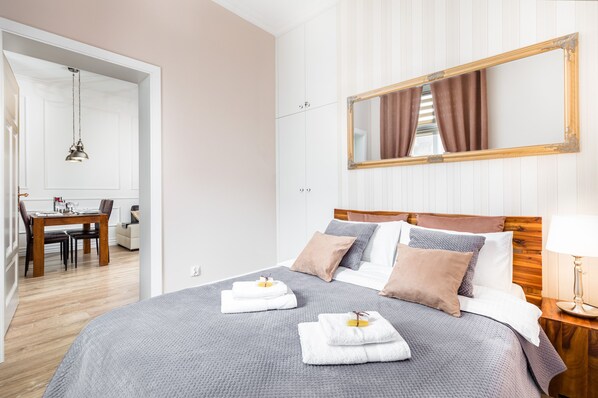 Brand new (commissioned in November 2019), spacious (56 m2) and modern apartment for 4 people. Previously luxury urban residence of Stettiner aristocracy therefore architecture, combining the classic of a 100-year-old building with modernity, interior design and colors of the apartment, refer to the climate of the residence from the turn of the 19th and 20th centuries.. The apartment is located in a historic middle-class house from the end of the 19th century, perfectly situated only 100 m from the central train station and 300 m from the old town at the quiet Zawiszy Square with picturesque view of the river Oder Valley and its islands. At the back of the building there is a free garage. The doors to the staircase and to the apartment are opened electronically . All windows overlook the River Oder . In the apartment there are a free Wi-Fi, wide selection of TV channels and Netflix. living room is linked with seperate kitchen. There are a 49 -inch TV and a comfortable sofa with a large, extendable sleeping space for 2 people i. The kitchen is equipped with all necessary appliances and dishes. Coffee, tea and mineral water are available for the guests free of charge. The bedroom is equipped with a comfortable king-size bed, a spacious wardrobe and a desk; there are also an ironing board, an iron and a drying rack in it. White sheets, pillows and duvets are anti-allergic. The bathroom is equipped with a washing machine, a set of towels and free cosmetics. A baby cot is available on request