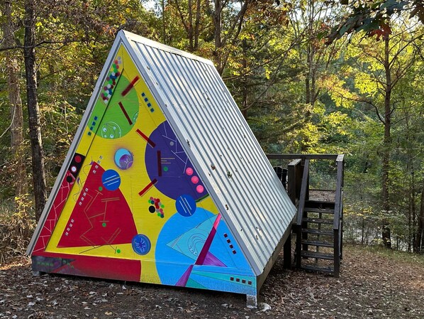 Fully air conditioned and heated bedroom chalet for two on elevated deck with peaceful forest view in Bohamia, our 268 acre private woodland retreat. Unique A-Frame with an interior that feels like a large tent. Luxury queen mattress, linens, interior and exterior lighting, and electrical outlets. Your private deck has Adirondack chairs, water dispenser, coffee maker, and your own Solo Stove fire pit. Each A-frame serves as a canvas for a local visual artist.