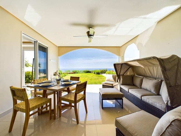 Step outside to the expansive terrace, a haven of tranquility with lush greenery and sweeping ocean views. A table for four and a comfortable seating arrangement invite you to savor meals or simply unwind while enjoying the sea breeze in the rattan outdoor sunbathing sofa with roof.