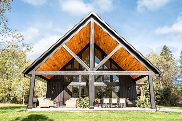 The fully equipped kitchen is ready for any meal preparation, and the spacious covered outdoor patio offers a perfect gathering space with dining and lounging areas, along with an outdoor grill. On warmer evenings, enjoy roasting marshmallows and sharing stories around the large fire pit.