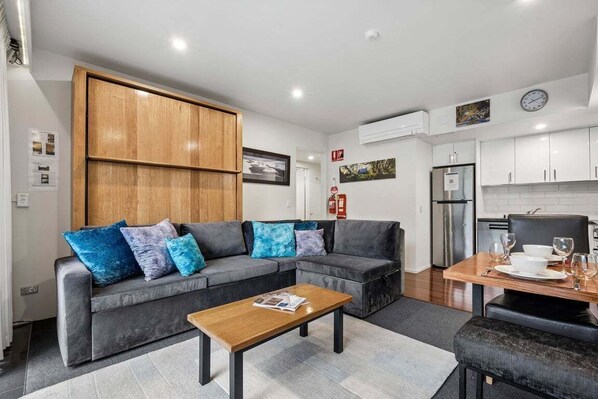 Relax in the comfort of a King split bed in the bedroom, while a large comfortable corner sofa in the living area invites you to unwind and recharge. The fully equipped kitchen, complete with a Nespresso coffee machine, allows for culinary adventures and cozy mornings with your favorite brew.