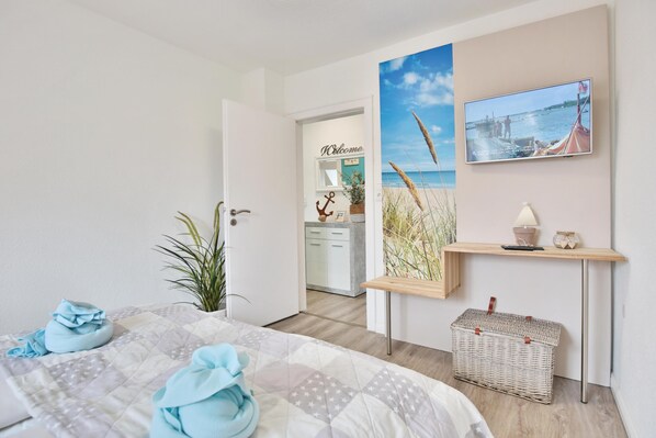 Das Schlafzimmer hält ein Doppelbett mit Einzelmatratzen (90cm x 200cm), eine neu gestaltete TV Wand mit einem weiteren Smart-TV für kuschelige Abendausklänge und eine Büchertruhe für Lesebegeisterte mit der ein oder andere Bettlektüre bereit.