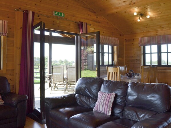 Wohnbereich: Mit Holzofen, DVB-T-TV, DVD-Player und Terrassentüren zum Garten.