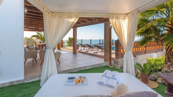Auch der Außenbereich des Hauses wird Sie begeistern. Hier können Sie köstliche Mahlzeiten, die Sie zuvor im Grillbereich zubereitet haben, auf der überdachten Veranda genießen. Außerdem können Sie sich am Pool, der umzäunt und mit einer Außendusche ausgestattet ist, entspannen. Sie können sich in einem der Liegestühle sonnen und dabei den atemberaubenden Ausblick auf den Ort Torrox, das Meer, das Tal des Flusses Torrox, sowie die Bergkette Tejeda im Hintergrund genießen.