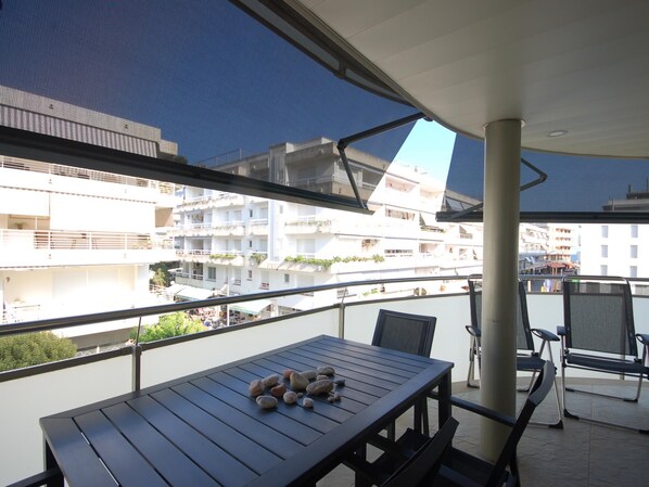Herrliche Markisen auf der Terrasse, mikroperforiertes Material, das den Schutz der Sonne erhält, ohne Sie davon abzuhalten, hindurch zu sehen.