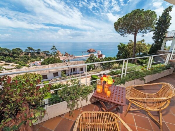 "Zen", 5-Zimmer-Reihenhaus. Geräumig, sehr komfortabel und gemütlich eingerichtet: Wohn-/Esszimmer mit 1 Diwanbett (135 cm, Länge 190 cm), Digital-TV. Ausgang zum Gartensitzplatz. Küche (Backofen, Geschirrspüler, 4 Glaskeramikplatten, Mikrowelle, Tiefkühler). Ausgang zum Gartensitzplatz, zum Schwimmbad. Bad. Keine Heizmöglichkeit. Obergeschoss: 1 Doppelzimmer mit 1 franz. Bett (150 cm, Länge 190 cm), Bad/Bidet/WC und Ventilator. Ausgang zum Balkon. 1 Doppelzimmer mit 1 franz. Bett (135 cm, Länge 190 cm), Ventilator. 1 Doppelzimmer mit 2 Betten (90 cm, Länge 190 cm), Ventilator. Bad/WC. Terrassenmöbel, Gartengrill. Panoramasicht auf das Meer. Zur Verfügung: Waschmaschine, Bügeleisen, Fliegengitter, Kinderhochstuhl, Babybett bis 2 Jahre, Haartrockner. Internet (WLAN, gratis). Parkplatz Nr. 14 (coche pequeño) (überdacht), Höhe 2 cm, Breite 2 cm. Bitte beachten: geeignet für Familien. TV nur ES. Buchung nur mit Familien. HUTG013403 // Reg. Nr.: ESFCTU000017021000467501000000000000000000HUTG0134035