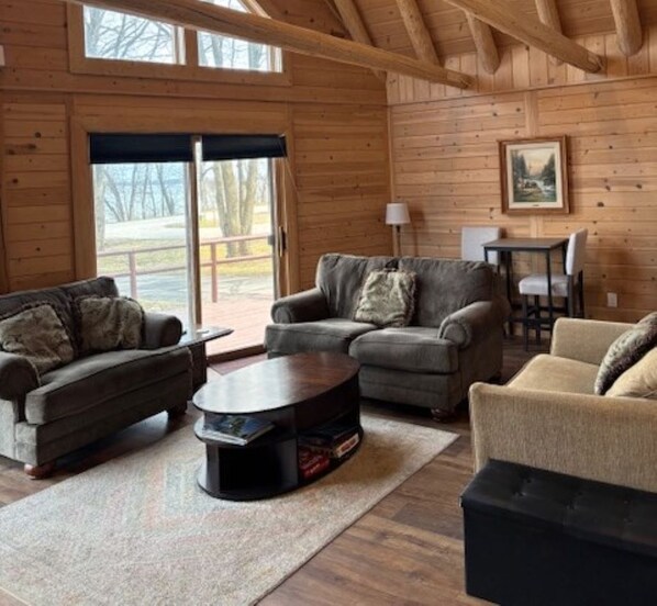 Gorgeous log "A-Frame" home with a large deck. This property has 104 feet of private waterfront directly across the street. The waterline is completely sandy, large, and the bottom is also sandy...perfect for any age! A fire pit is located on the beach, along with some chairs to enjoy the glow of the fire at night. Additional folding chairs may also be used, as they're located around the second firepit in the front yard. The deck features a gas grill with a griddle top, as well as tables and chairs for dining and enjoying that bottle of wine that your purchased locally after wine touring. Cheers!
