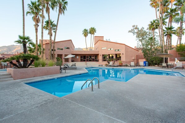 For those seeking relaxation, unwind by the clubhouse in the shimmering pool or take a soak in the jacuzzi, surrounded by lush landscape and the picturesque mountain backdrop. Play ping pong or pool, or read near the fireplace. As the sun sets, gather around the property or clubhouse fireplace and relish the cool desert evenings, making memories with loved ones or new-found friends.