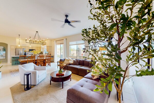 Step inside and be greeted by an interior that seamlessly combines comfort and style. The spacious living areas are adorned with tasteful decor, showcasing a contemporary aesthetic that perfectly complements the surrounding desert landscape. The windows flood the rooms with natural light, inviting the outdoors in and framing the stunning vistas beyond. This home is equipped with all the modern conveniences you could need, including central air-conditioning, streaming-capable TVs (using your own accounts), and a washer/dryer for added convenience. For meal prep, the well-equipped, full kitchen offers a number of stainless steel appliances and an island with counter seating.