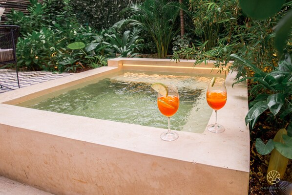 Amazing Studio for 2 or 3 guests 1Bed/1Bath with private terrace and plunge pool in the heart of Aldea Zamá, 10 min drive to the beach and only 5 min to Tulum center, AC, Wifi, fully equipped kitchen, located on ground floor with lots of Natural Ligth, and by night illuminated by Casa Studio (Azulik).