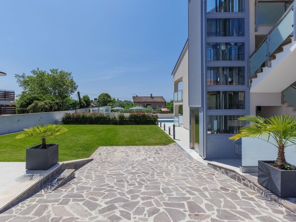 Murine 3 km von Umag: Mehrfamilienhaus "Villa Galici", Baujahr 2022. Im Weiler Galići, 1 km vom Zentrum von Murine, sonnige Lage, 2.5 km vom Meer, 2.5 km vom Strand. Zur Mitbenutzung: Grundstück 1'000 m2 mit Rasen, Schwimmbad eckig beheizt (10 x 5 m, 150 cm tief, saisonale Verfügbarkeit: 01.Jan. - 31.Dez.) mit Innentreppe und Rollladenabdeckung. Aussendusche. Im Hause: Internetzugang, Tischfussball. Parkplatz beim Haus auf dem Grundstück. Einkaufsgeschäft 1.5 km, Restaurant 800 m, Bushaltestelle 4.1 km, Kieselstrand 2.5 km, Felsstrand 2.5 km. Wanderwege ab Haus 100 m, Radweg 150 m. Der Besitzer akzeptiert keine Jugendgruppen.