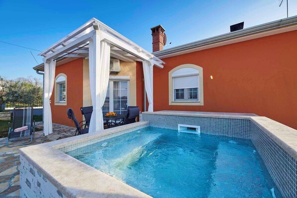 Alle Pools stehen Ihnen zur alleinigen Nutzung zur Verfügung. Außenpool (Anfang Mai bis Anfang November in Betrieb beheizbar 2 m x 2 m 1,2 m tief). Beheizter Pool bis 27°C.