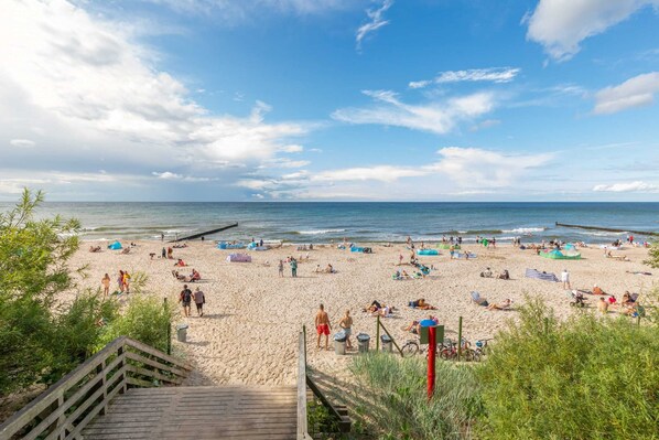Diese stilvolle Wohnung befindet sich in der 2. Etage der modernen Wohnanlage Perłowa Przystań in Sianożety. Das Gebäude befindet sich direkt am Sandstrand, der einer der größten in der Gegend ist und sich durch seine große Breite auszeichnet. Nach dem Verlassen des Gebäudes gibt es auch eine Promenade mit einem ausgewiesenen Fahrradweg. Sianożęty ist ein abgelegener Küstenort in unmittelbarer Nähe von Ustroń Morski - eine perfekte Wahl für Gäste, die einen erholsamen, ruhigen und naturnahen Urlaub schätzen. Dank der hervorragenden Lage der Wohnung ist alles, was Sie brauchen, leicht zu erreichen. In der Umgebung gibt es auch viele interessante Orte für Familien mit Kindern. Für Liebhaber der aktiven Freizeitgestaltung gibt es zahlreiche Radwege, darunter den Küstenradweg Eurovelo, auf dem man in etwa 40 Minuten das nahe gelegene Kołobrzeg erreicht. Es lohnt sich auch, einen Abendspaziergang entlang der Promenade in Ustroń Morski (2,2 km) zu machen oder mit der Familie den Seilpark in Kołobrzeg (14,5 km) zu besuchen.