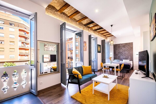 Willkommen in unserem tadellos gestalteten Studio-Apartment, wo zeitgenössische Eleganz und Funktionalität zusammenkommen, um einen wirklich bemerkenswerten Raum zu schaffen.