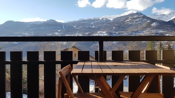 Herrlicher Blick auf die Berge, Balkon mit Tisch und Stühlen.