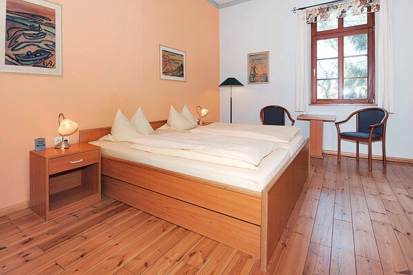 Zimmer mit Doppelbett, Waschtisch im Zimmer, Dusche und WC, Internetzugang über WLAN möglich, optimal für 2 Personen.