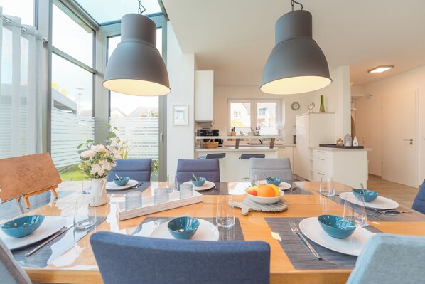 Das Kaptains Huus besticht durch seine Helligkeit, den modernen Wintergarten, seine räumliche Großzügigkeit und die charmante Kombination aus gemütlichen nordischem Flair gepaart mit eleganter und hochwertiger moderner Ausstattung bis in die kleinsten Details. Mit u.a. seinem Spielespeicher, vorhandenem Spielzeug, Baby- und Kinderstuhl ist das Kaptains Huus ein perfektes Refugium für Familien - auch wenn mal „schlechtes“ Wetter sein sollte.