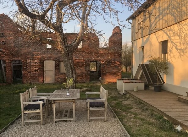 Wer das kurze Stück Feldweg überwunden hat, wird vom freundlichen Haupthaus unseres ehemaligen Dreiseithofs empfangen. Die moderne Landhausküche ist voll ausgestattet mit Induktionsherd, Kühlschrank, Gefrierfach, Spülmaschine und einem einmaligen Blick auf die Streuobstwiese. An kälteren Tagen finden alle am großen Esstisch in der Küche Platz. Wenn es die Temperaturen zulassen kann man auch wunderbar draussen zwischen Fliederbüschen und Backsteinruinen essen und trinken.