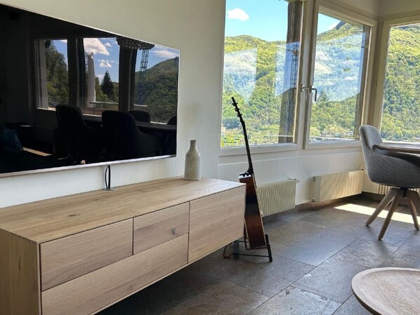 Obergeschoss: Das geräumige und helle Obergeschoss wurde 2024 neu möbliert und umfasst ein offenes, grosses Wohn-/Esszimmer mit Panoramafenstern, offenem Kamin, Esstisch für sechs Personen, Kabel-TV mit internationalen Sendern und Flachbildschirm. Von hier aus gibt es einen direkten Zugang zum Garten und zur Terrasse. Die moderne Küche, die 2021 eingerichtet wurde, ist mit einem Kombi-Steamer, Backofen, Geschirrspüler, Induktionskochplatten, Toaster, Wasserkocher, Airfryer und einer Nespresso-Kaffeemaschine ausgestattet (Kapseln müssen selbst mitgebracht werden). Auch von der Küche aus gelangt man auf die Terrasse. Ein separates Gäste-WC rundet das Angebot im Obergeschoss ab.