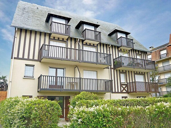 Residenz "Le Vert Clos", auf 3 Stockwerken. Im Ort, 1 km vom Zentrum von Villers-sur-Mer, 15 m vom Meer, 15 m vom Strand, Strasse zu überqueren. Parkplatz. Einkaufsgeschäft 1 km, Einkaufszentrum 100 m, Restaurant 500 m, Bushaltestelle "Eglise" 1 km, Thermalbad "Thalasso de Deauville" 7.1 km. Golfplatz (18 Loch) 5.5 km. Bitte beachten: kein Fahrstuhl vorhanden. Die Schlüsselübergabe findet bei der Agentur Interhome in Cabourg statt, 12 km.