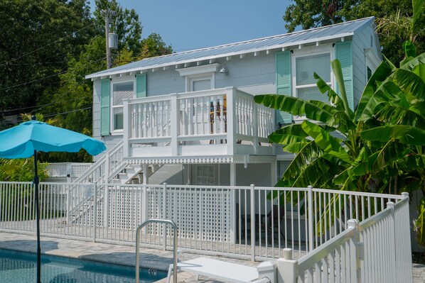 Check-in is a breeze the 4 digit code to door sent via email prior to stay. The kitchen appliances are awesome. Frig has ice maker. Pots and pans, cups and plates available and some silverware. Coffee pot and toaster. We did alot of cooking which was very convenient. No bathroom door or bedroom door. Living room area very small had to push chairs back pretty far towards kitchen area in order to open out the sofa bed. My kids age 9 and 12 loved the corner table area to hang out and eat with their tablets. There is a door leading drom bedroom out to the patio pool area and main entrance door at the kitchen. Parking is in the grass along the ally behind the building. Long term tenant upstairs uses the paved parking spot so you can't. It wasnt very clean. Dead bugs under the furniture. Glad I took a vaccuum cleaner with me came in handy. Also no rugs at entryway doors and the brick walkway and patio has fine stones that stick to your shoes and feet so rug would have been a big help to keep the place clean. The sofa and chairs were stained and worn out looking. There was a musty smell also we sprayed everything with febreze to help. Some of the windows had only a screen and the wind out type so could feel warm air coming in from outside 90 degree weather. Pool water was warm and not refreshing but most of the time my kids had pool to themselves. Less than 5 min walk to beach but had to cross divided highway which i didn't like otherwise good safe location and quiet.