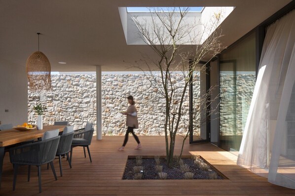 Die luxuriöse kroatische Villa Serenity Pula 3 zur Miete mit beheiztem Pool befindet sich auf einem großzügigen Grundstück, umgeben von Ruhe und Grün. Den zentralen Platz im sorgfältig gepflegten Garten nimmt ein beheizter Swimmingpool (36 m2) mit Massagefunktion ein, umgeben von modernen Liegestühlen zum Sonnenbaden. Auf dem Plateau rund um den Pool gibt es eine gemütliche Sitzecke und einen Außenwohnbereich mit Esstisch und Gasgrill. Die Glaswände dieser modernen istrischen Familienvilla zur Miete mit Familie und Freunden können vollständig geöffnet werden, sodass dieser Raum mit dem Garten der Villa verbunden ist, oder sie können je nach Wunsch auch geschlossen werden.