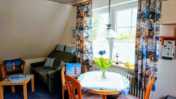 Die Ferienwohnung 2 im Obergeschoss in Hooksiel bietet auf ca. 30 m² Platz für 2 Gäste. Sie verfügt über ein Schlafzimmer mit Doppelbett und zusätzlichem Bett sowie ein Bad mit Dusche und separatem WC. Der Wohnbereich mit Küche ist gemütlich eingerichtet und umfasst ein Sofa, einen Essbereich und einen LED-Sat-TV. Die private, voll ausgestattete Küche bietet Kühlschrank, Herd, Backofen, Mikrowelle, Geschirrspüler, Toaster und Kaffeemaschine. WLAN und ein eigener Grill stehen zur Verfügung. Auf der Terrasse mit Gartenmöbeln können Sie entspannen.