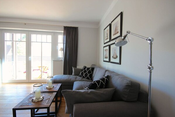 Genießen Sie Ihr Frühstück auf der sonnigen Terrasse. Im eigenen Garten mit großem Holzdeck laden ein XXL-Strandkorb (Apr.-Okt.) und Deckchairs zum gemütlichen Ausklang des Tages ein.
