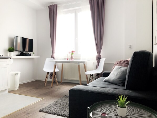 Modernes, funktionales, geräumiges und neu renoviertes 32 Quadratmeter großes Apartment mit einem Schlafzimmer. Eine offene Küchenzeile, ein funktionales Bad und ein geräumiges Wohnzimmer. Im Schlafzimmer befindet sich ein 140x200 Doppelbett sowie ein Kleiderschrank. Im Wohnzimmer befindet sich ein Sofa, das sich leicht in ein bequemes Bett für 2 Personen verwandeln lässt.