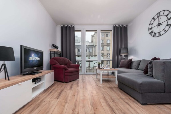 Perfekt gelegenes, komfortables und geräumiges Apartment für die anspruchsvollsten Gäste. Die Wohnung bietet Platz für 4 Personen und besteht aus einem Wohnzimmer mit Küchenzeile, einem gemütlichen Schlafzimmer und einem Badezimmer mit WC und Dusche. Die Wohnung verfügt auch über einen Balkon mit Panoramablick auf die Stadt. Die moderne Anordnung der Wohnung und die komplette Ausstattung mit der notwendigen Küchen- und Badausstattung sowie die kostenlose WLAN-Verbindung und ein Flachbildfernseher garantieren einen komfortablen Aufenthalt. Die sorgfältig fertiggestellte Wohnung, ihr moderner Stil und die hellen Farben verleihen der Wohnung eine gemütliche Atmosphäre und unterstreichen ihren hohen Standard.
