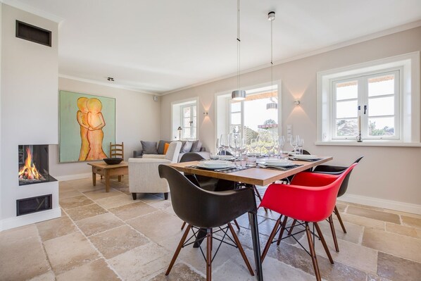 Kuschelige Abende in Ihrem durchdesignten Wohnbereich werden durch einen Gaskamin gekrönt, den Sie individuell über eine Fernbedienung steuern können, ultra bequem und genial einfach. An Ihrem schönen Eichentisch genießen Sie schöne Stunden, während Sie auf ein XXL Kunstwerk einer namhaften deutschen Künstlerin schauen. Eine anspruchsvolle Haustechnik versteht sich im Hüs Minde eben so, wie fantastische Marken-Boxspringbetten made in Germany.