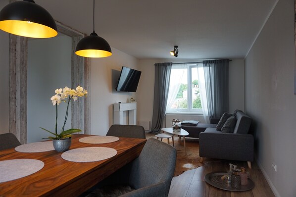 Alltagshelfer wie; Geschirrspüler, Wasserkocher, Toaster, Herd (Ceran)-Backofen, Kaffeemaschine, Kapselmaschine sowie ein großer Kühlschrank lassen Sie bequem Urlaub machen. Im Preis inbegriffen sind Flat/ TV, WLAN, Handtücher und Bettwäsche. Ein Stellplatz für Ihren PKW ist direkt am Haus verfügbar (kostenfrei).