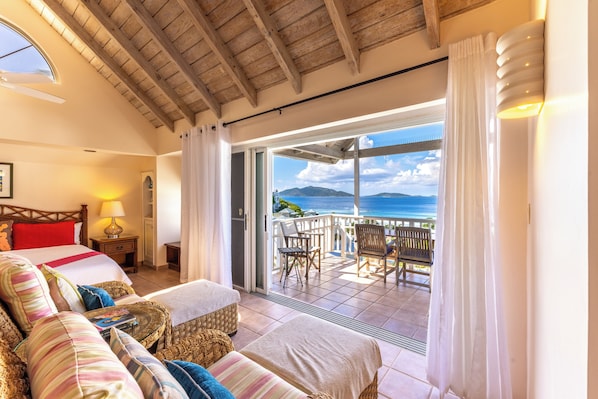 3) Upstairs you’ll find the Penthouse suite with its stunning ocean view, comfortable Caribbean furnishings and the calming sounds of the waves below. Airy and filled with sunlight, it has an open studio-style layout with a high vaulted ceiling. Equipped with a king-size bed, built in desk, AC, 32" flat screen TV with DVD player & satellite, you’ll have all your home comforts but with a much better view! The kitchenette is perfectly equipped for preparing simple meals with cooktop, refrigerator, coffee-maker, toaster oven & toaster. The 3 piece bathroom has a spacious walk-in shower with ability to sit down. Of course this area provides dressing drawers and closet space too.