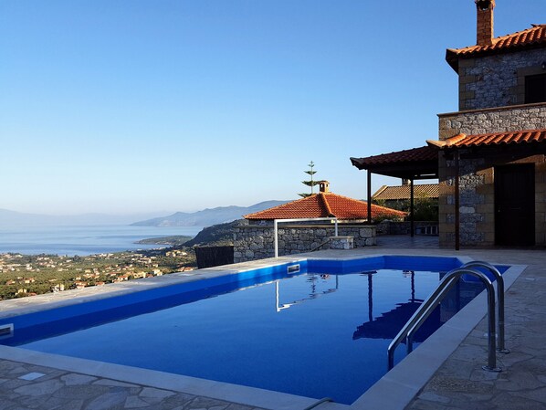 Wenn Sie nach einer Ferienvilla aus Stein suchen, die mit allen modernen Annehmlichkeiten ausgestattet ist, einen privaten Pool mit absoluter Privatsphäre, einen atemberaubenden Meerblick und einzigartigen Sonnenuntergängen, in einer sehr ruhigen Gegend, weit weg von allem, aber so nah an den Einrichtungen des Hauptort von Stoupa, dann betrachten Villa Arsinoi.