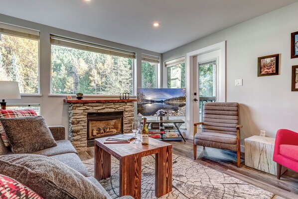 Guests love the soaring 40-foot lofted windows, cozy alpine ambiance, and stunning mountain views—perfect for relaxing after a day of skiing, snowboarding, or exploring.