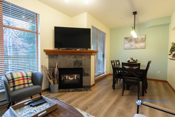 Other popular amenities include an interior ski rack, gas fireplace, balcony with gas BBQ, flat screen televisions in the living room and master bedroom, private washer dryer and a jetted bathtub in the upstairs bathroom. Both bedrooms house Queen-sized beds and there is also a Queen-sized sofabed with memory foam mattress in the living area.
