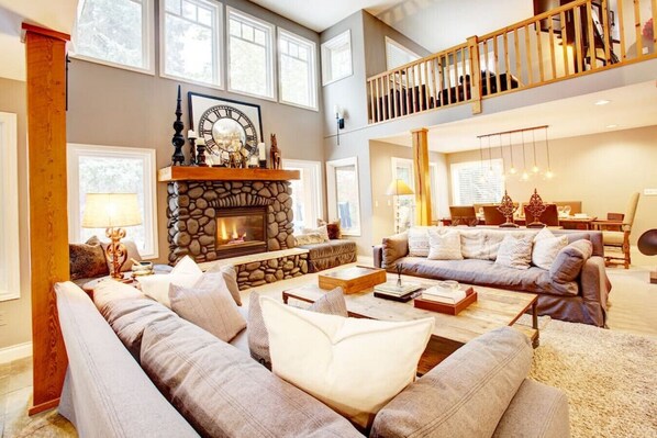 As you enter through the front door, the cathedral-height ceilings, enormous fireplace, and open floor plan with a living room, kitchen, and dining area will blow you away. You will find yourself in a true family ski chalet with all the comforts of home. Enter through the private garage and store all your skis or bikes and equipment safely inside. Laundry facilities and a ski boot and glove dryer are provided for our guest`s utmost comfort. The main level also has a bathroom, laundry room and bedroom.