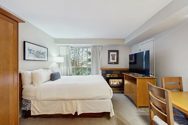 Warm studio with easy slope access, jetted tub, gym, & mountain decor