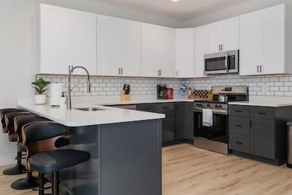 This is a brand new home in Wilmington's Historic District--a rare find! This unit has a private entrance and can sleep up to 8 people. The interior is modern with an open kitchen and living space on the first floor, along with a full bathroom and a bedroom/office. There is a collapsible dining table and four folding chairs in addition to the four breakfast bar chairs. The bedroom has a twin daybed with a trundle as well as a desk for a dedicated working area. The trundle can be raised flush with the daybed to make one larger bed rather than two twin beds. Upstairs you'll find a full bathroom, laundry room, two bedrooms with queen beds along with a master that has a king bed and private bathroom. Note that the master bedroom sits directly above the bedroom of the other unit in the duplex, so please refrain from loud noises or heavy footsteps!