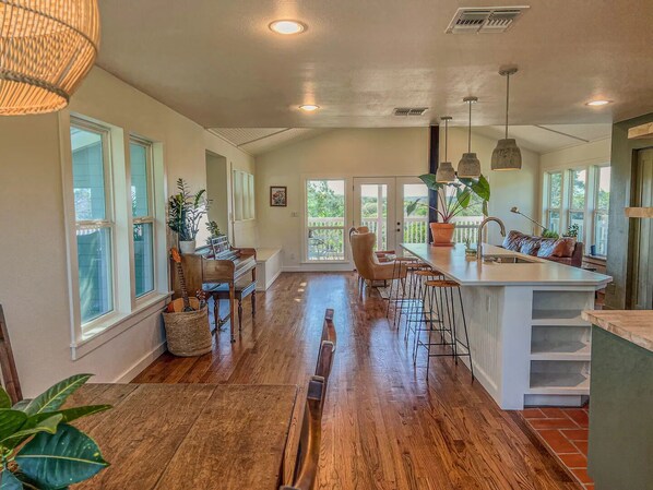 Best floor plan I've seen. Everyone slept on the first floor abd the second floor was for cooking or using the extra shower or sitting on the deck or playing board games. There were eight of us and it was extremely roomy w plenty of places to hide out and be alone if you want to, including the two decks and one was screened in, which was nice. Very convenient to Wimberley downtown 15 mins, but also you felt like you were in a secluded area. We called it a treehouse because the views were all around. The owners answered several questions for us very promptly. There were plenty of amenities, including a stocked pantry, which we didn't need anything from but it was nice just in case. We will be back for sure. The air conditioner was ice cold in case anyone needs to know that bring a sweatshirt to sleep in, if needed. The home is lovely.