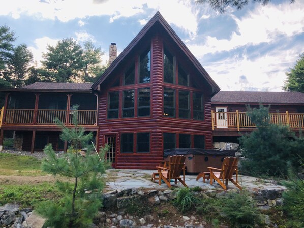 Each floor has its own private sleeping quarters. With the master bedroom located on the first floor including ensuite bath and walkout screened in porch; offering beautiful views of the property and water. The extended loft offers additional sleeping for the more adventurous crowd with 2 queen beds and 2 twin beds. The lower level is a walkout level to the stone patio and oversized hot tub, also offering a spacious family room with entertainment center, woodstove, a second master bedroom with queen size bed and full bathroom.