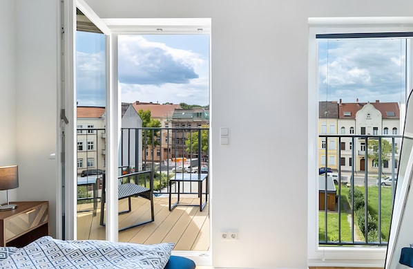 Alle Gästezimmer im Ferienhaus 'Elbe Central Loft' mit Balkon, WLAN und Klimaanlage verfügen über Komforts wie eine Klimaanlage, aber zusätzlich auch Annehmlichkeiten wie WLAN.