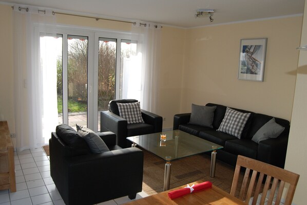Unser Ferienhaus ist eine Doppelhaushälfte und für vier Personen geeignet, mit zwei Schlafzimmern, Wohn- Essraum, mit Radio und TV, sowie WLAN, einer voll ausgestatteten Küche mit Elektroherd, Mikrowelle und Spülmaschine.