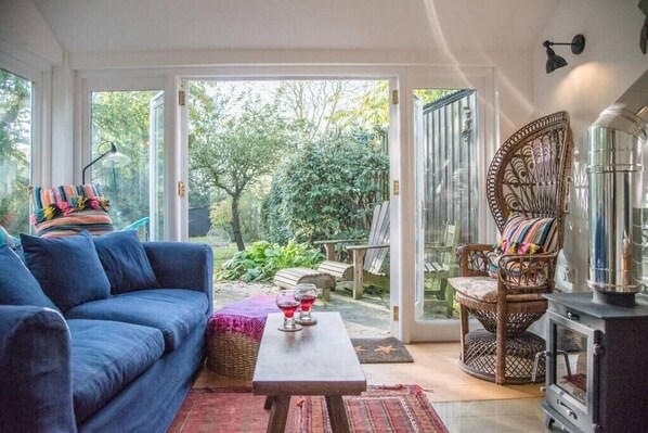 Offene Küche / Wohn- / Essbereich - voll ausgestattete Küche mit Smeg-Geräten und Geschirrspüler. Schöner Holzofen im Wohnbereich mit Blick auf den privaten Garten.