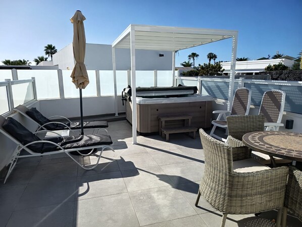 Through the sliding doors you enter the terrace with the Jacuzzi, 2 sunbeds, 2 adjustable chairs and a table with 2 chairs.