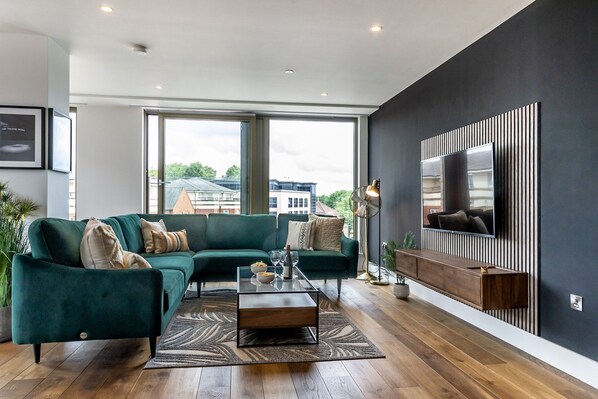 With touches of interior design throughout, every aspect has been carefully thought through. Whether you are in York for a theatre break, a race weekend or just as a special treat for you and your family or friends, The Lux has been designed to ensure that you have a comfortable, stylish base from which to head out into York. There's plenty of seating in the lounge area on the stunning "peacock green" sofa, this is coupled with a wall mounted Smart TV, so you can enjoy your down time, whether it is an evening in or pre dinner drinks, there is room for everyone.