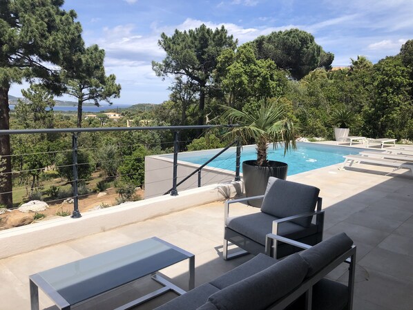 - One-storey living terrace with heated swimming pool (4x8), plancha, large dining table, garden furniture. Unobstructed view of Pinarello Bay.