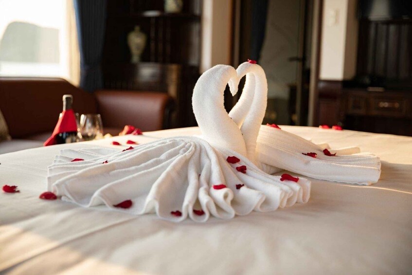 An Bord kannst du an einer Kochvorführung teilnehmen und etwas über die vietnamesische Esskultur erfahren. Der Koch und das Personal zeigen dir, wie man ein traditionelles Gericht aus Vietnam zubereitet. Genieße die Happy Hour an der Bar, während du den Blick auf die Bucht bei Sonnenuntergang genießt.